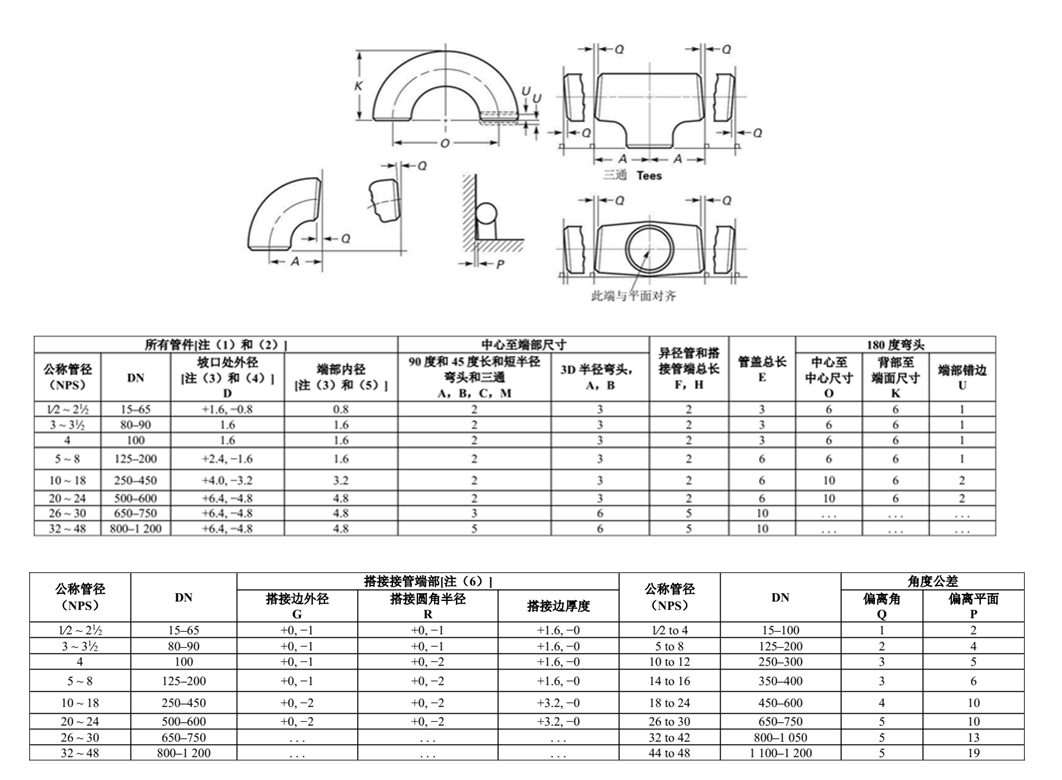 Short radius, long radius, reducing long radius, or 3D radius elbow 短半径弯头,长半径弯头或 3 倍弯曲半径弯头 |
