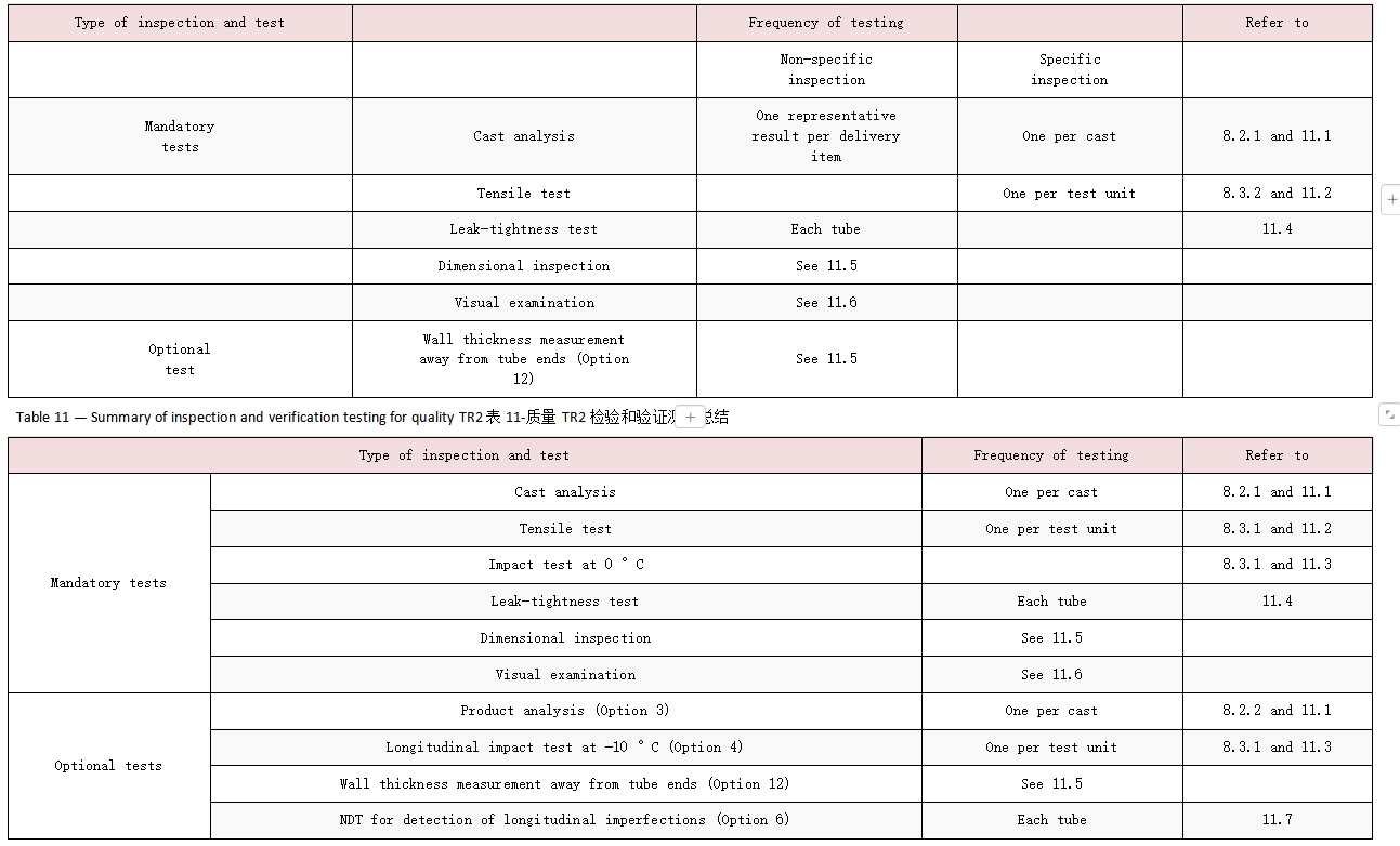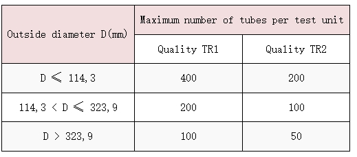  质量TR2:具有相同规定外径和壁厚、相同钢号、相同铸件、相同制造工艺的管子,如果适用,在连续炉中进行相同的正火处理,或在间歇式炉中在相同炉料中进行热处理。除非指定了选项10,否则指定外径小于或等于76.1mm的管子不需要通过铸造分开。