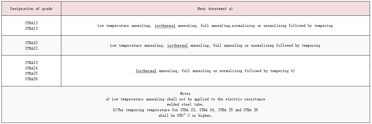 (c)Tubes shall be subjected to the Heat treatment specified in table 22.Other heat treatments not specified in table 2 shall be agreed between the purchaser and the manufacturer.