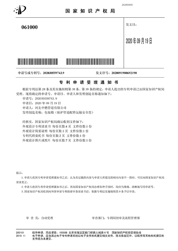 “包装箱(保护管道配件运输安全型)”专利申请受理通知书