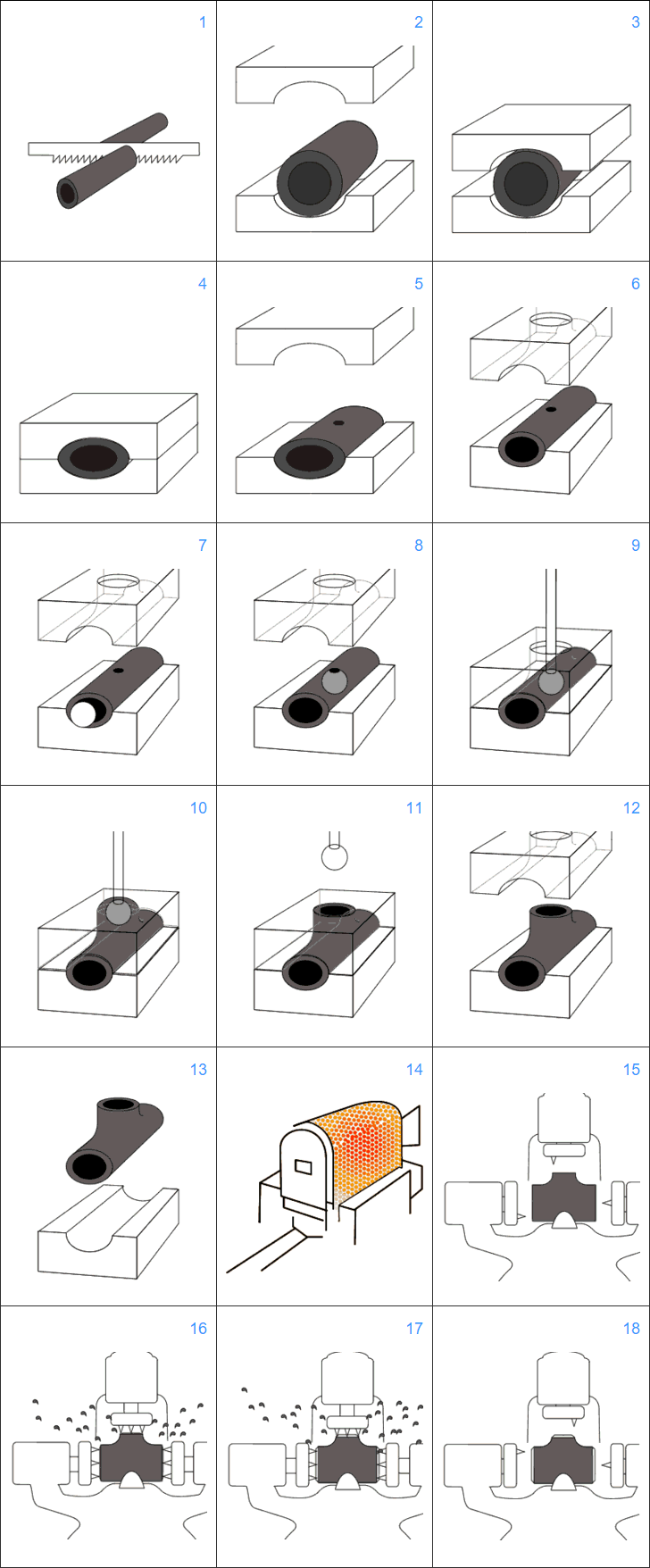 三通热压成形是将大于三通直径的管坯,压扁约至三通直径的尺寸,在拉伸支管的部位开一个孔;管坯经加热,放入成形模中,并在管坯内装入拉伸支管的冲模;在压力的作用下管坯被径向压缩,在径向压缩的过程中金属向支管方向流动并在冲模的拉伸下形成支管。整个过程是通过管坯的径向压缩和支管部位的拉伸过程而成形。与液压胀形三通不同的是,热压三通支管的金属是由管坯的径向运动进行补偿的,所以也称为径向补偿工艺。