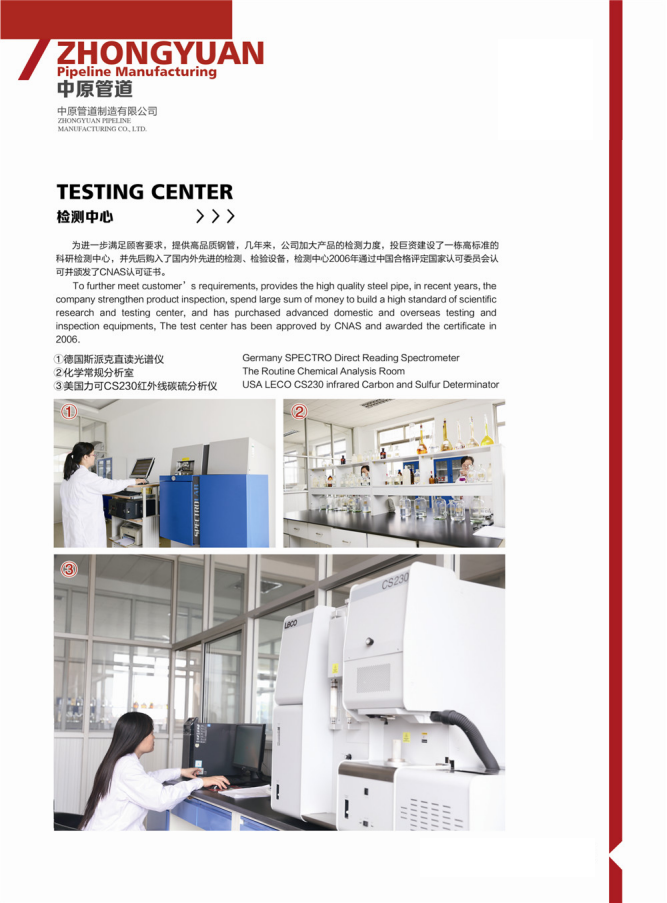 为进一步满足顺客要求,提供高品质钢管,几年来,公司加大看片软件免费的检测力度,投巨资建设了一栋高标准的科研检测中心,并先后购入了国内外先进的检测、检验设备,检测中心2006年通过中国合格评定国家认可委员会认可并颁发了CNAS认可证书。