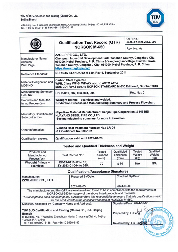 公司已通过挪威国家石油标准NORSOK M-650 ASTM A234 WPB认证。