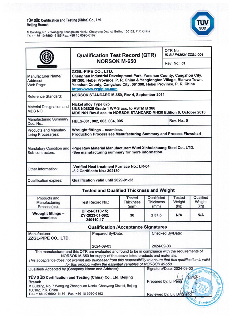 公司已通过挪威国家石油标准NORSOK M-650 ASTM B366 UNS N06625认证。