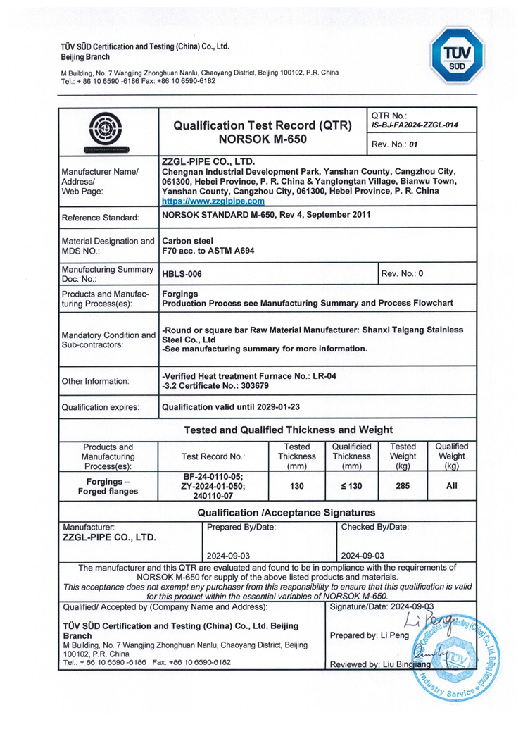 公司已通过挪威国家石油标准NORSOK M-650 ASTM A694 F70认证。